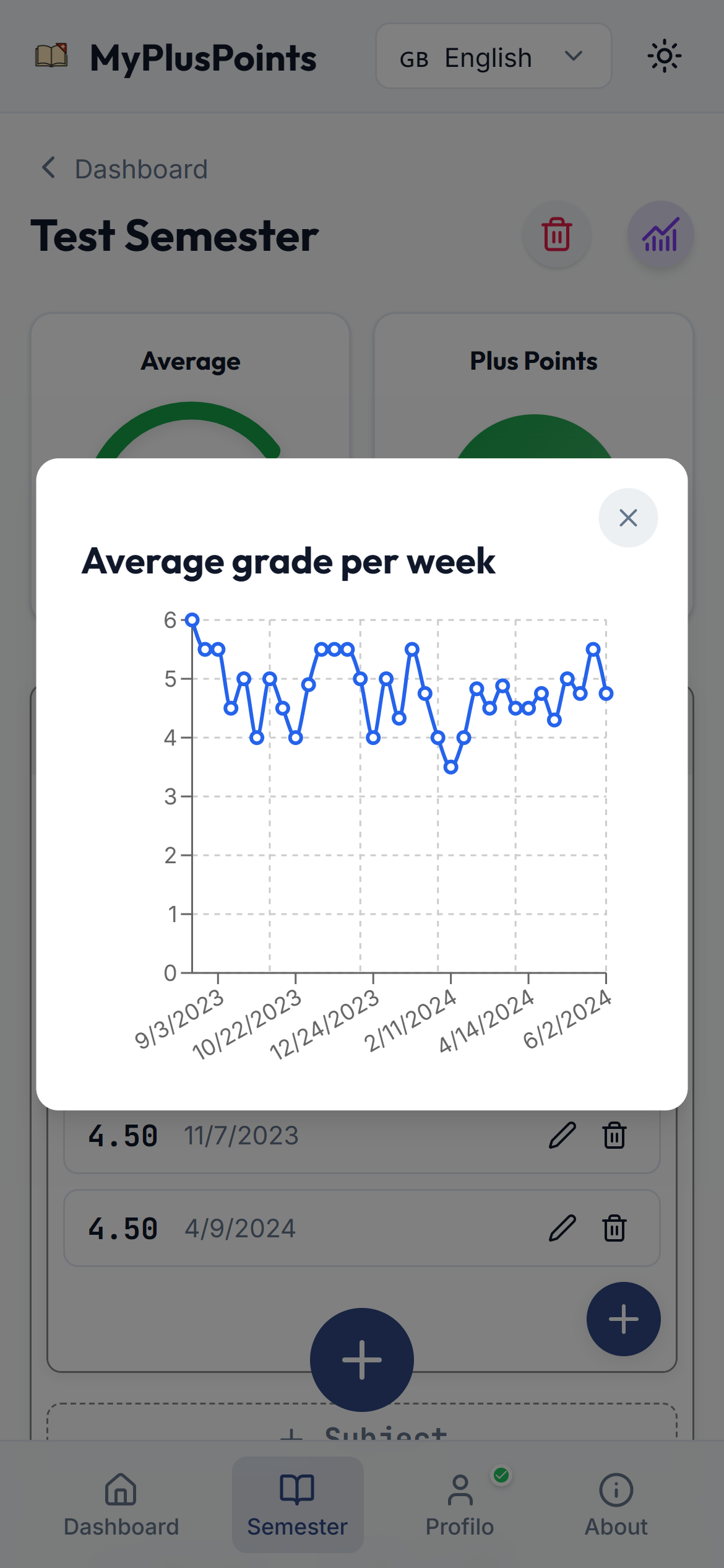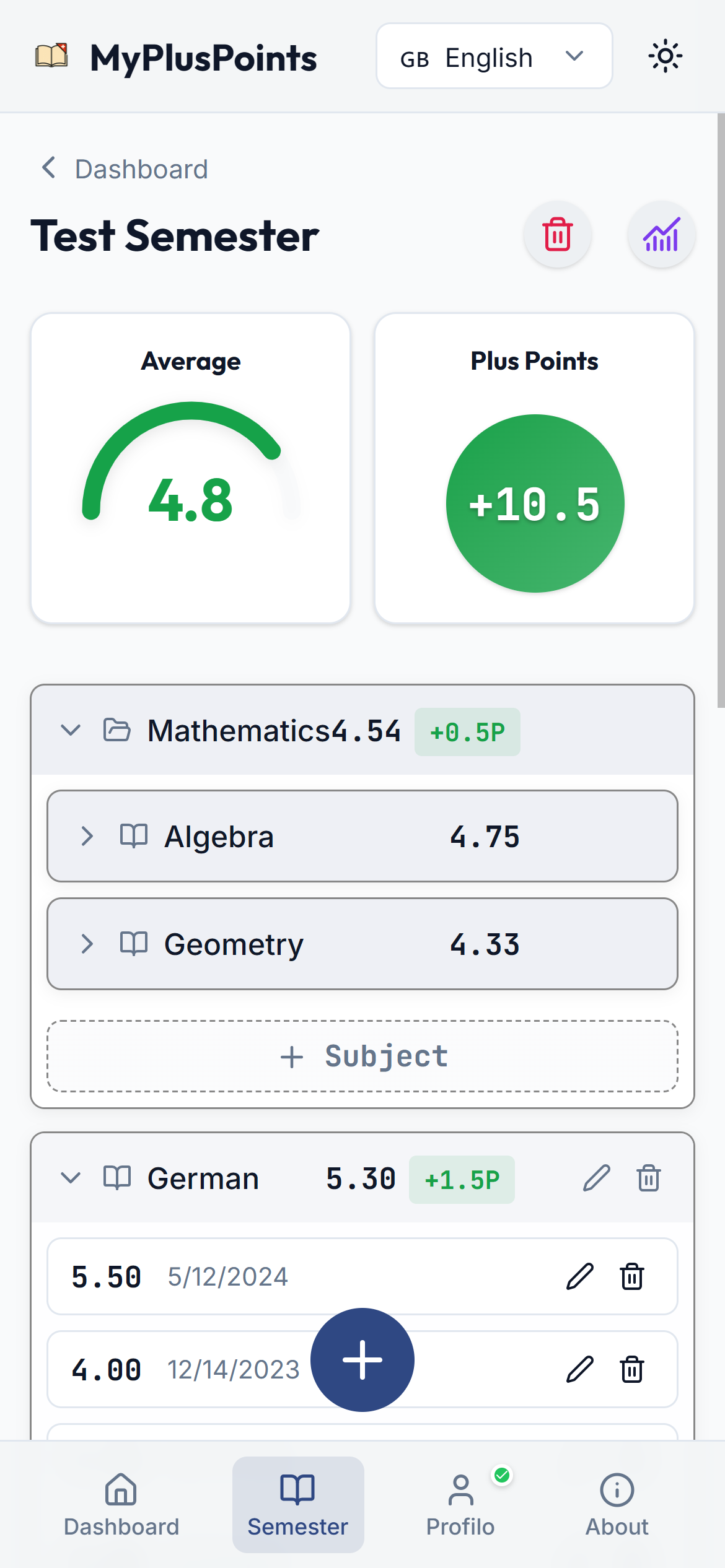 Add your grades and instantly see averages and plus‐points.