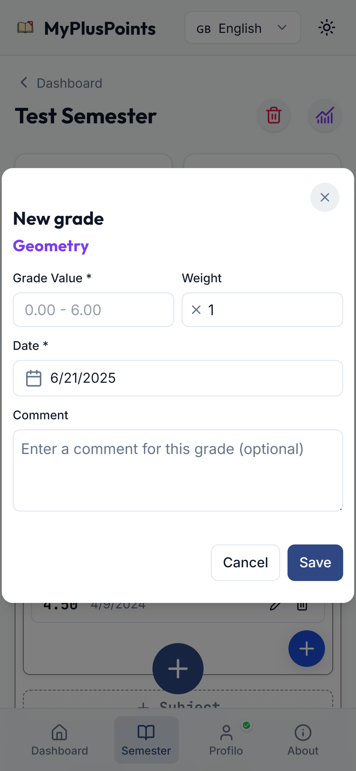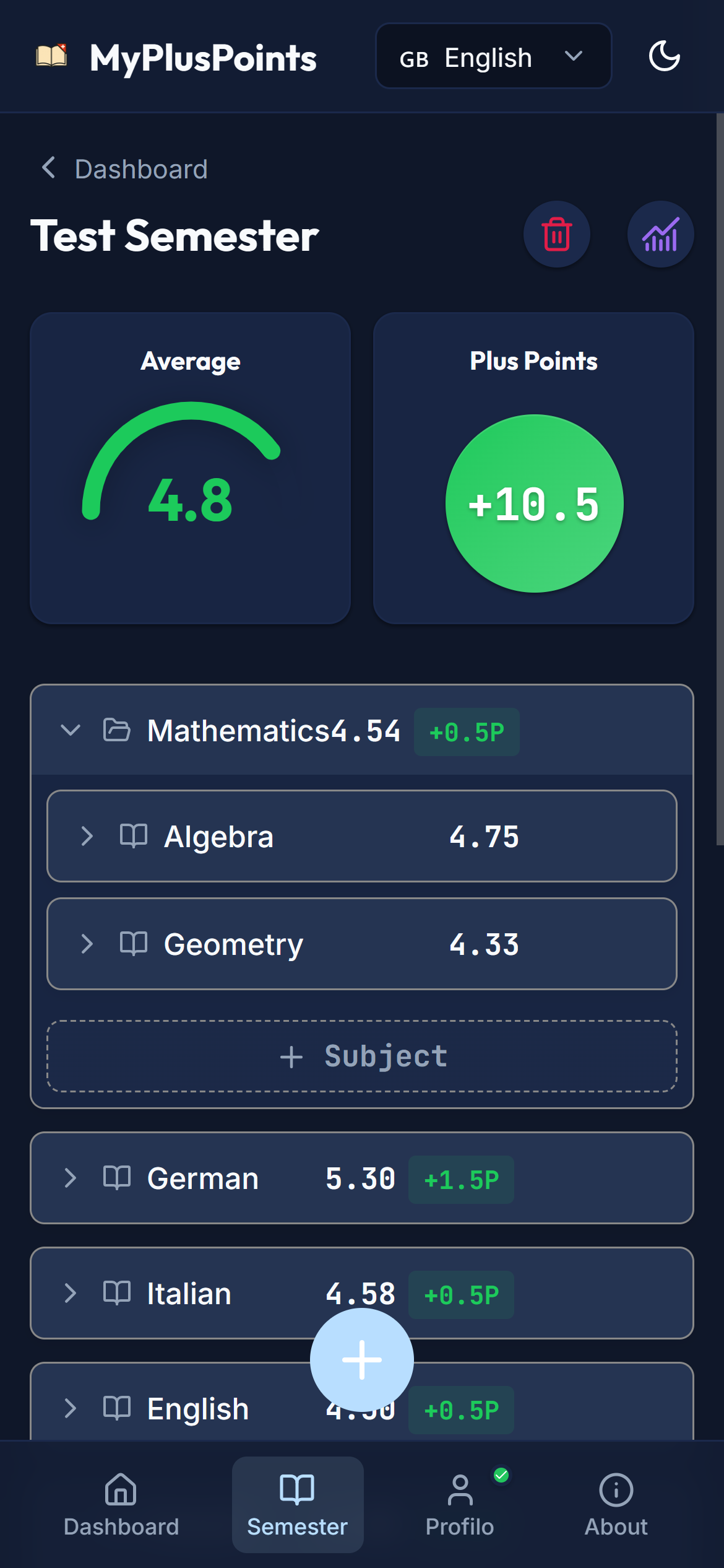 Add a new semester and enter your subjects.